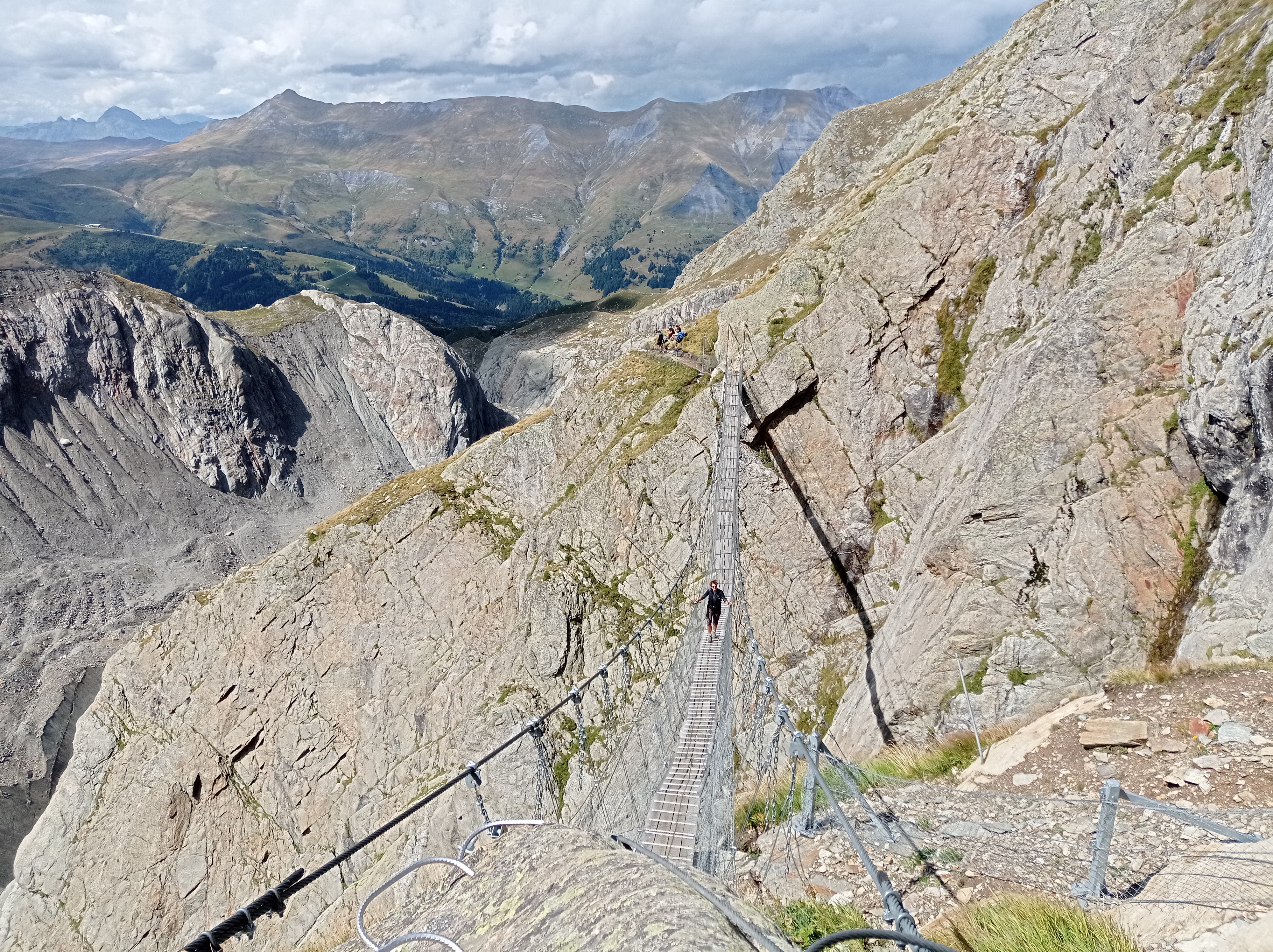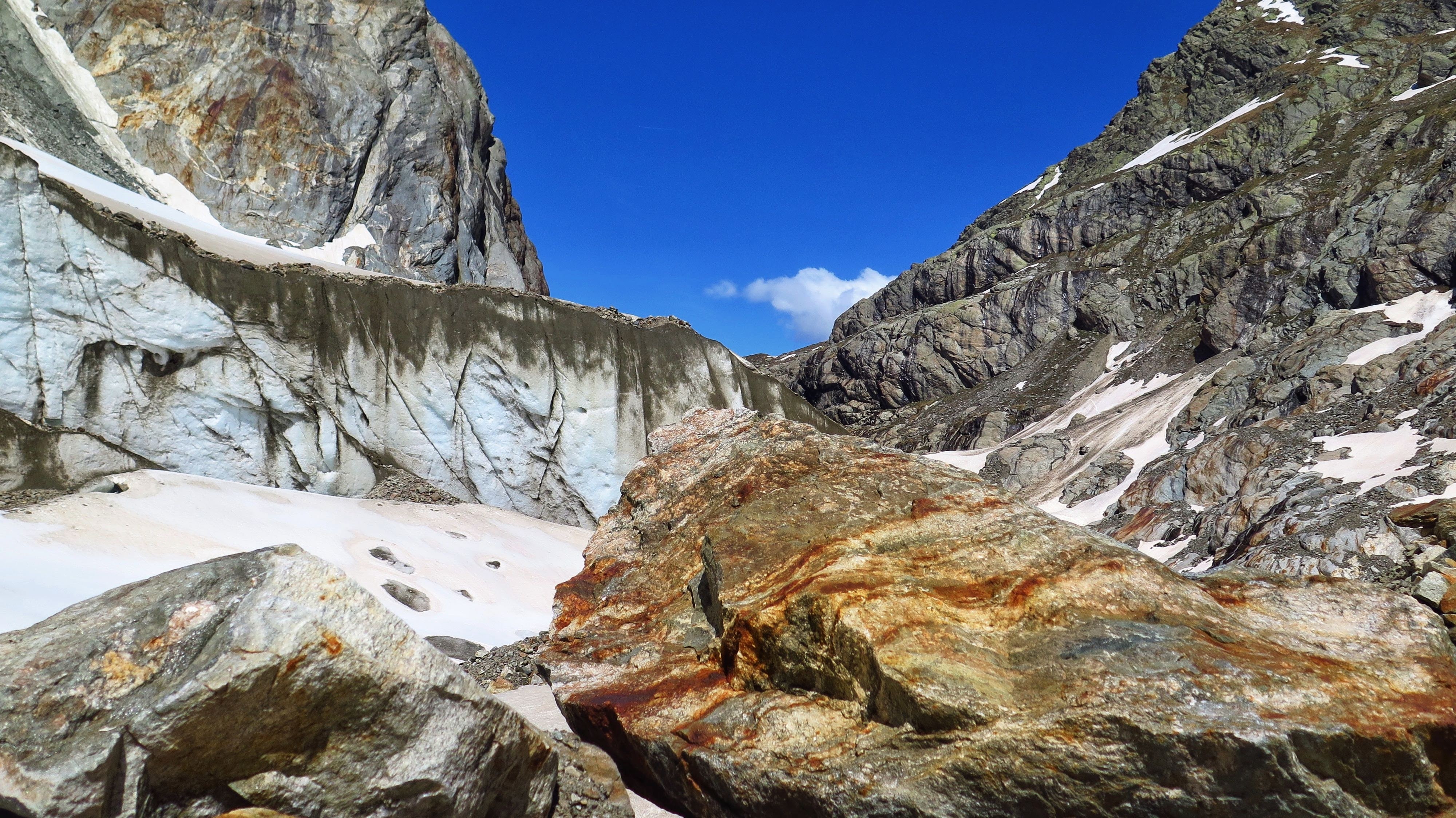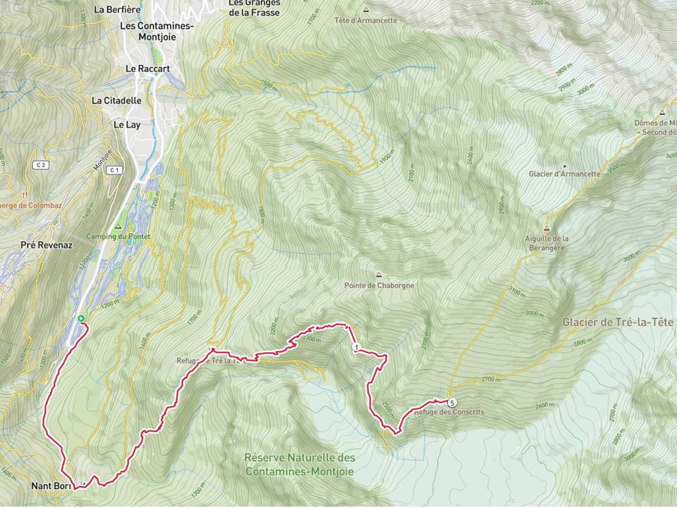 Pour voir les séracs du glacier de Tré la Tête au niveau Refuge des Conscrits, nous sommes partis de de Notre-Dame de la Gorge(1210 m), passage par le refuge de Tré la Tête (1970 m), puis celui des Conscrits (2602 m). Randonnée qui permet de très belles vues de la partie basse du glacier, mais qui reste réservée aux bons marcheurs. 17 km avec 1650 m de dénivelé positif. Plusieurs passages se font à l’aide de cordes. Il y a également un passerelle.
